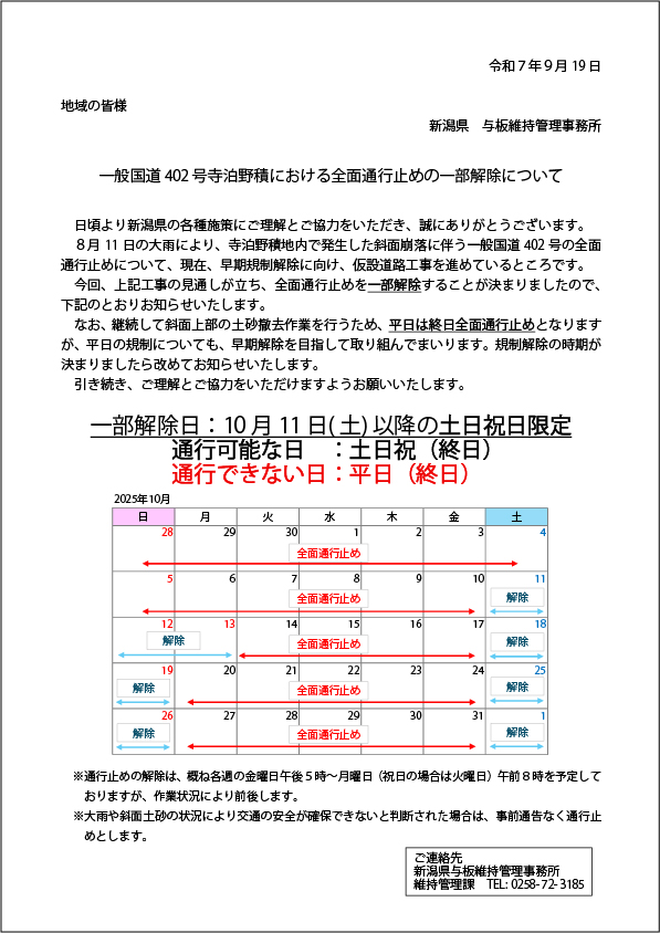 8月の集中豪雨による影響で国道402号線野積地区が一部土砂崩れのため、寺泊~野積の間が通行止めとなっておりますが、県より一部規制解除予定との知らせがございました。